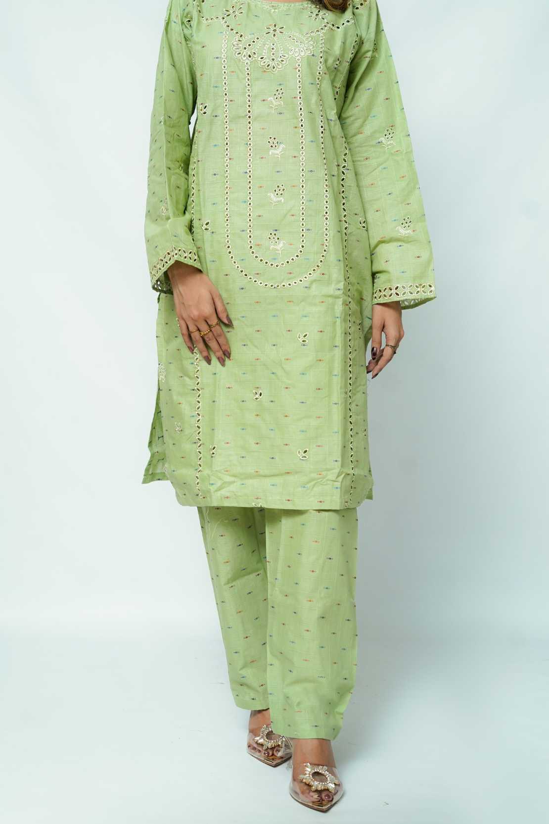 Cotton bindi fabric with boring work embroidered shirt with plain trouser making it a perfect two piece suite